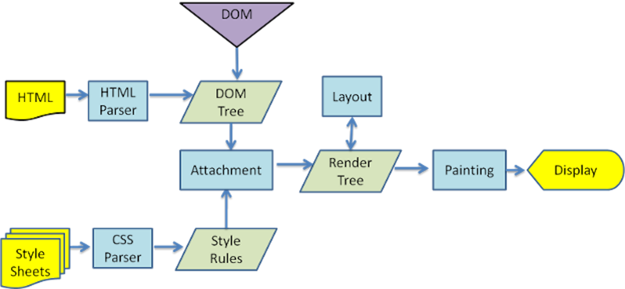 첨부된 이미지는 여러 렌더링 엔진들 가운데서 WebKit의 도식을 보여주고 있는데, WebKit이 아니라 다른 렌더링도 용어의 차이는 있으나 큰 틀의 작동방식은 동일하다. 각각의 단계가 무엇을 의미하는지 하나하나 살펴보도록 하자.