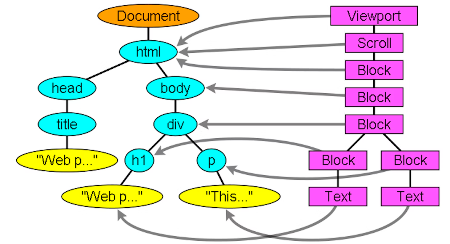 문서 구조에 따라 Render Object들을 트리 구조로 위계화한다. 최종적으로 DOM Tree(Output Tree, Parser Tree)가 만들어진다. Render Tree의 루트 노드는 자식 노드들인 블록(block)들을 모두 포함한다는 의미에서 컨테이너 블록(containing block)이라 부른다. 화면 내 시각적 요소들을 모두 포함하는 컨테이너 블록은 브라우저 창이 보여주고있는 범위인 Viewport에 해당한다(Webkit의 RenderView 객체, Firefox의 ViewportFrame에 해당한다). 이 루트 노드 아래에 다른 자식 노드를 추가해가면서 Render Tree가 구축된다.