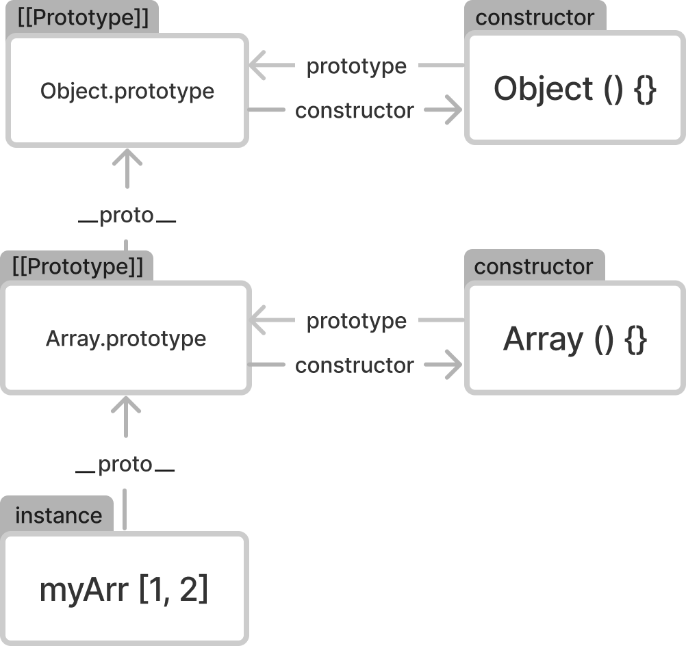 const myArr = new Array(1, 2)When we run console.dir() on myArr, we see that its prototype is JavaScript's native object Array.