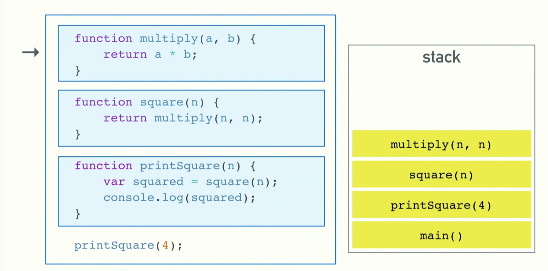 printSquare(4);call stack에는 가장 먼저 js 파일, 즉 프로그램 자체에 대한 스택이 가장 먼저 쌓인다. 편의상 이것을 main()이라는 함수 호출이 스택에 쌓인 것으로 이해하자. 그리고 나서 main .js 파일을 위에서부터 아래로 쭉 읽어내려가다보면 최초의 함수 실행인 printSquare(4)를 만나게 된다. 그러면 main()위에 printSquare(4) 를 쌓는다. printSquare(4)는 내부적으로 square(4)를 호출하고 있으므로 printSquare(4) 위에 square(4)를 쌓는다. 그리고square(4)는 또다시 multiply(4, 4)를 호출하고 있으므로 square(4) 위에 multiply(4, 4)를 쌓는다.