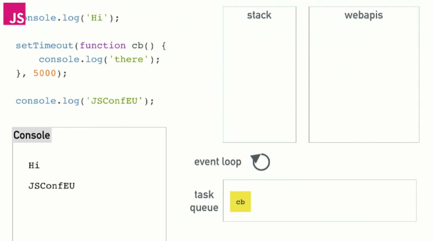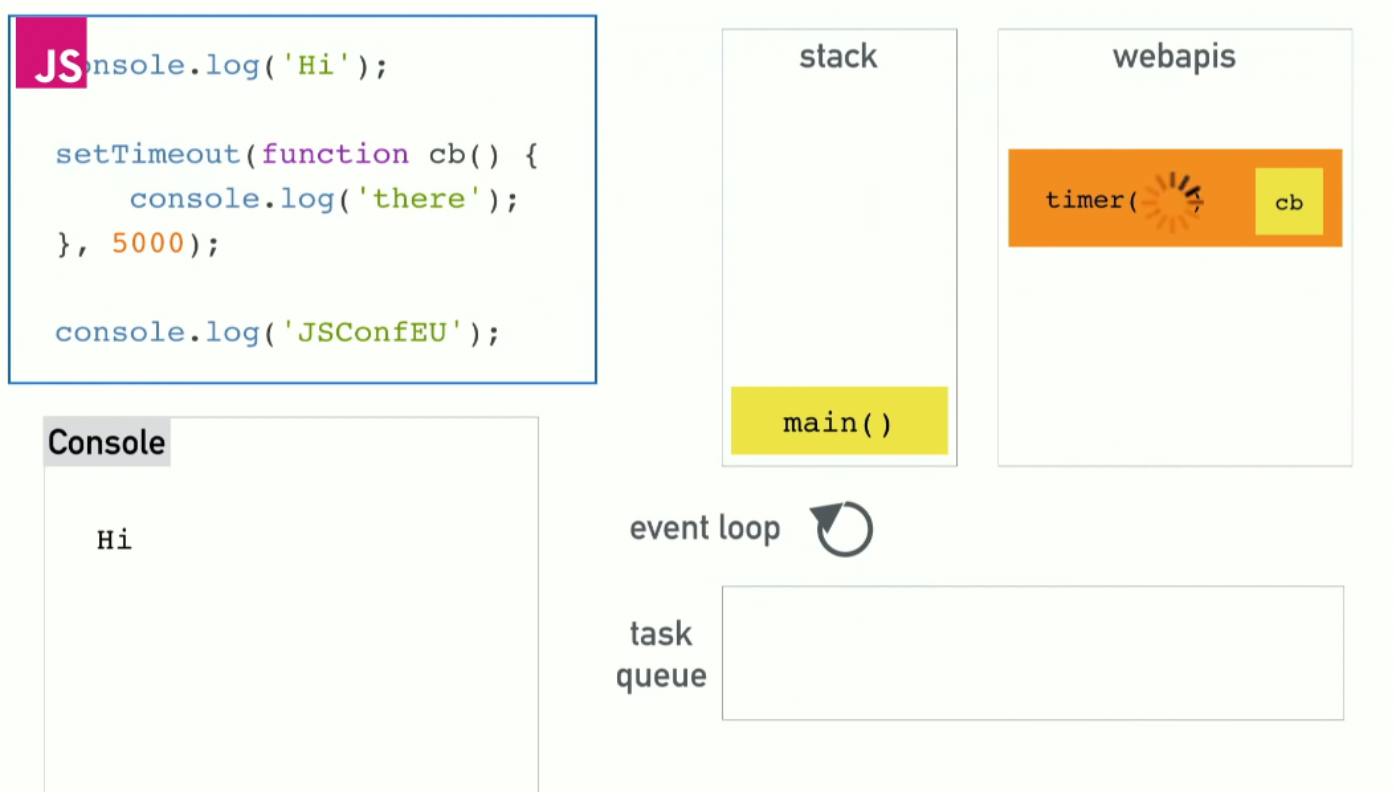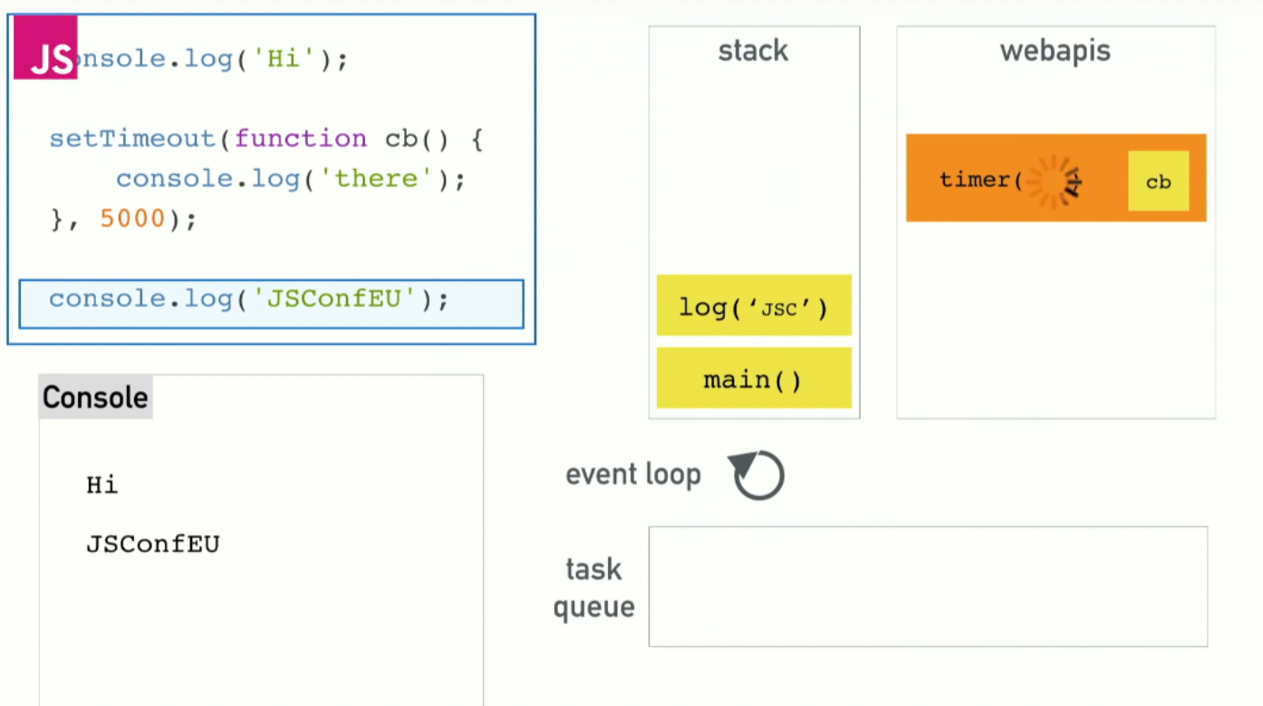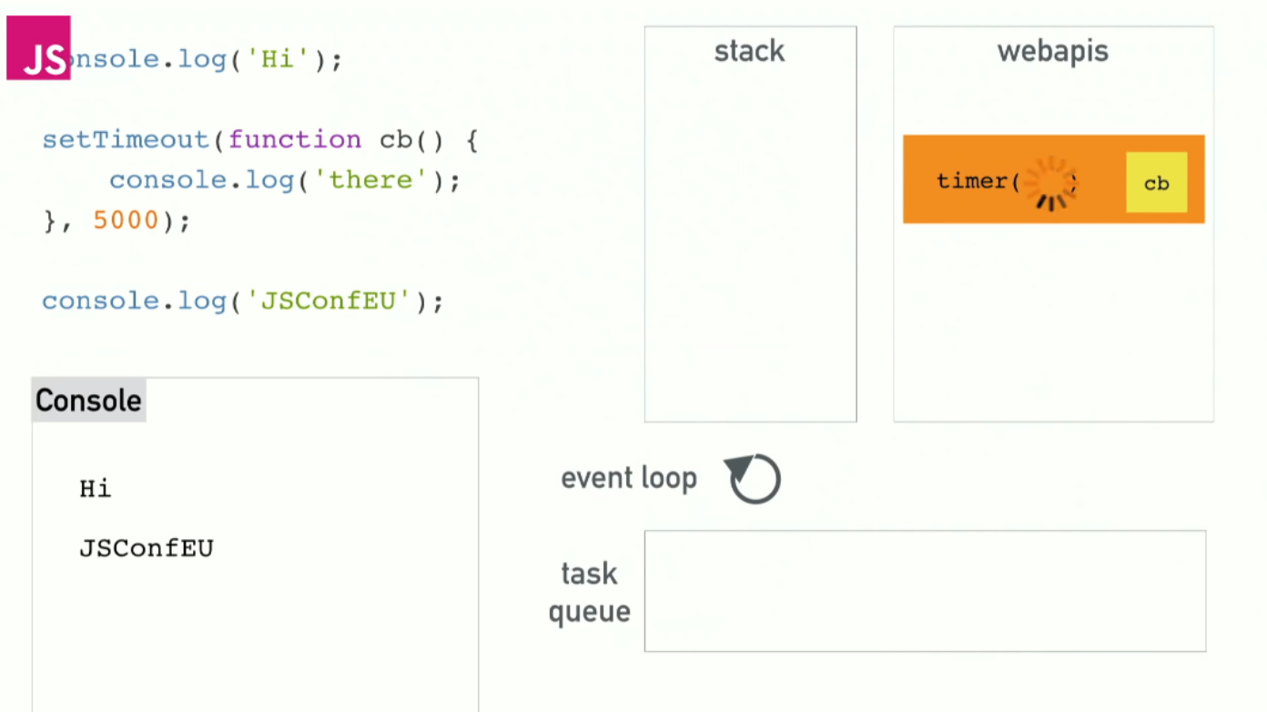 콜백이 5초간 기다리는지는 call stack이 아니라 WebAPI에서 관리한다. 덕분에 setTimeout(cb) 다음에 나오는 console.log('JSConfEU') 와 같이 단순한 작업이 5초씩이나 기다리지 않고 바로 실행될 수 있다.