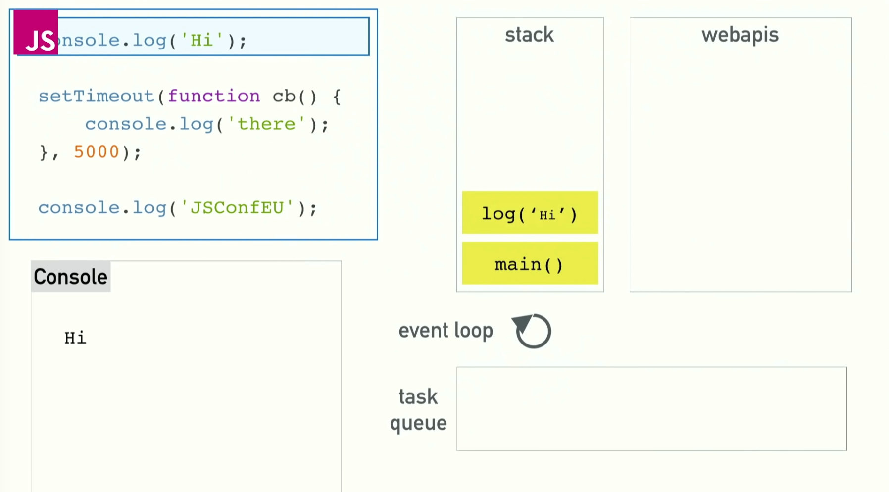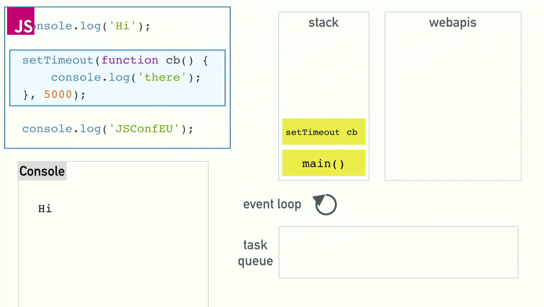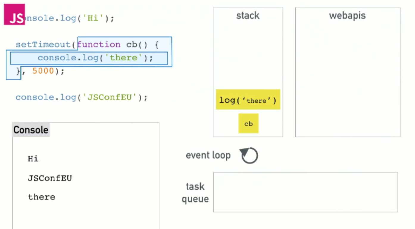 콜백이 5초간 기다리는지는 call stack이 아니라 WebAPI에서 관리한다. 덕분에 setTimeout(cb) 다음에 나오는 console.log('JSConfEU') 와 같이 단순한 작업이 5초씩이나 기다리지 않고 바로 실행될 수 있다.