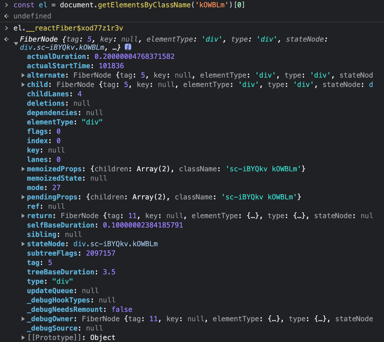 Each fiber in the React application corresponds to an element in the virtual DOM tree and contains the state, props, and underlying DOM element of the component it renders. To access a fiber node, you can run a React application and look for a key that begins with "__reactFiber".