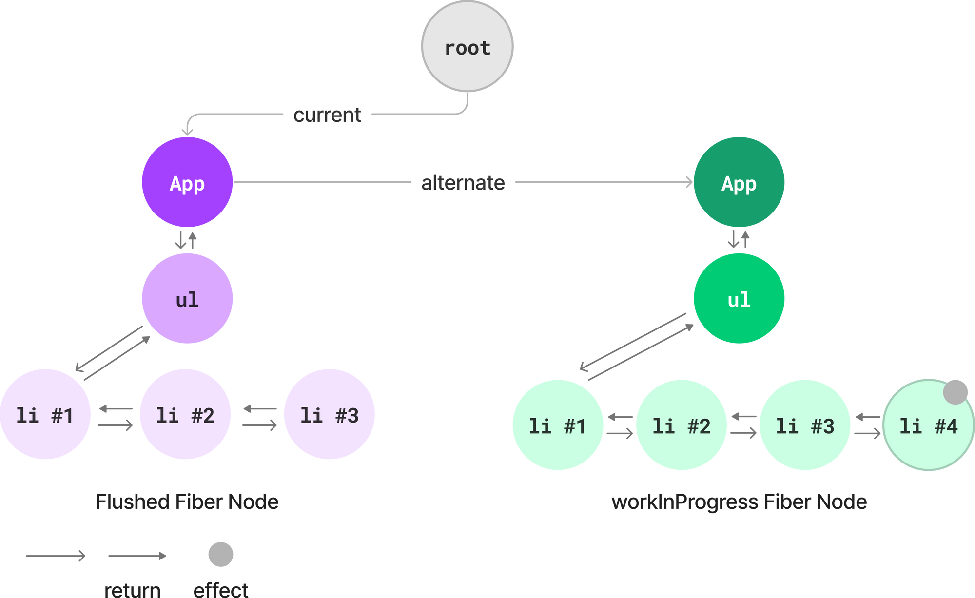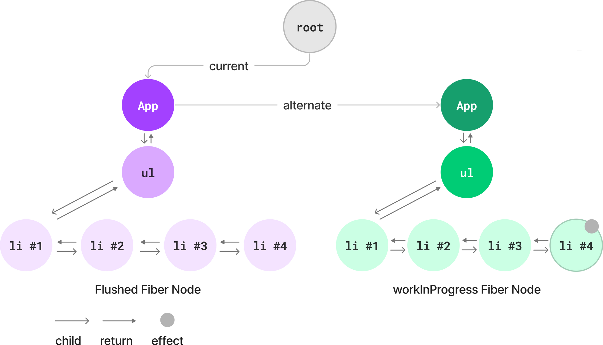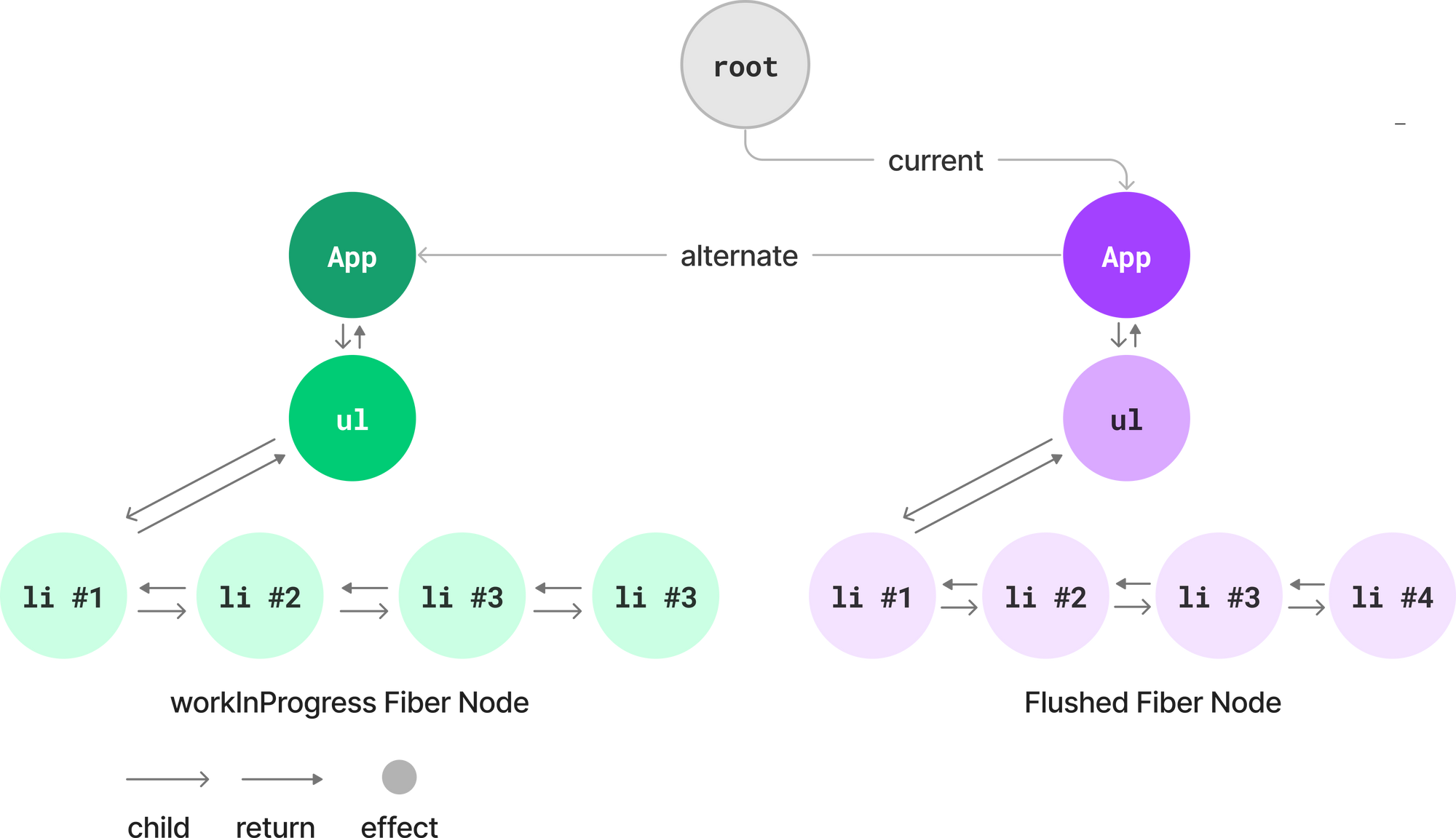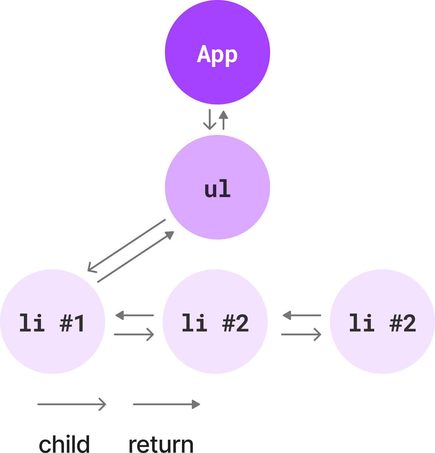 Imagine there's an app with a ul tag with 3 li tags as its children. The following is a simplified singly-linked list created by the fiber reconciler.