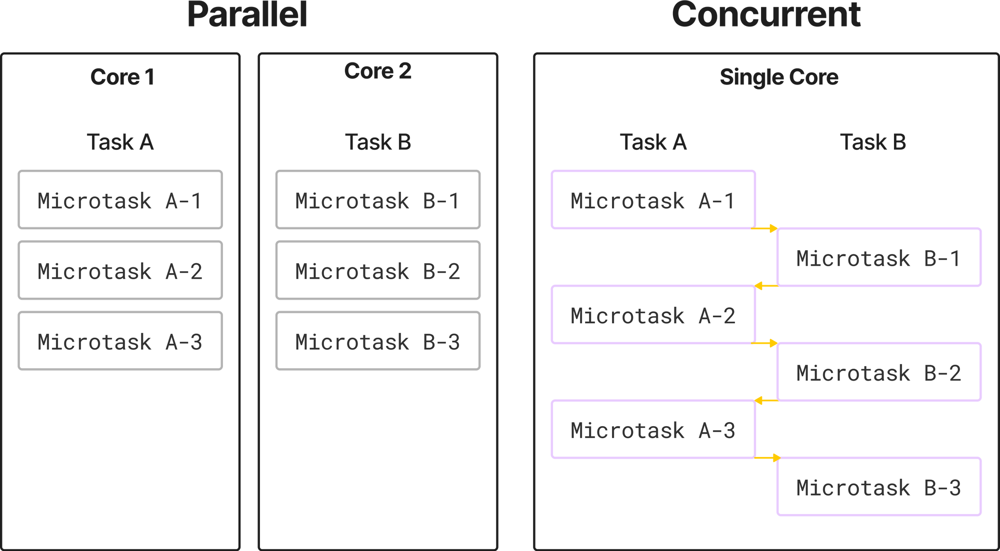 When tasks are processed in parallel, multiple cores handle different tasks simultaneously. This means that multiple things are happening at the exact same instant. However, when using a single core, it is not possible to process multiple tasks in parallel. Instead, the core can break a higher-order task into smaller microtasks, switch context between these microtasks, and handle them within the same time frame. In this case, the works are being done concurrently. By doing so, the core can give the impression that two higher-order tasks are being processed in parallel.
